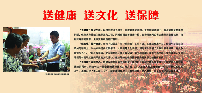 长江村是中国幸福村、中国十佳小康村,在率先实现“家家住别墅,人人有股份,户户有存款,个个有金银,年年有保障”的基础上,我们将紧紧围绕“送健康、送文化、送保障”的民生主线,打造富民惠民升级版、提升社会事业含金量,进一步擦亮幸福长江的“金字招牌”。